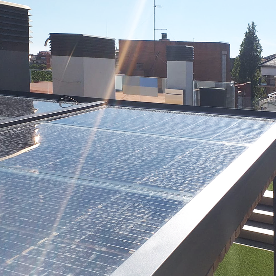 Diseñada sobre la estructura de la pérgola BIOSTANC, incorporamos una estructura estanca con paneles solares encapsulados, obteniendo una pérgola que genera electricidad a la vez que aporta un elegante espacio para el exterior.