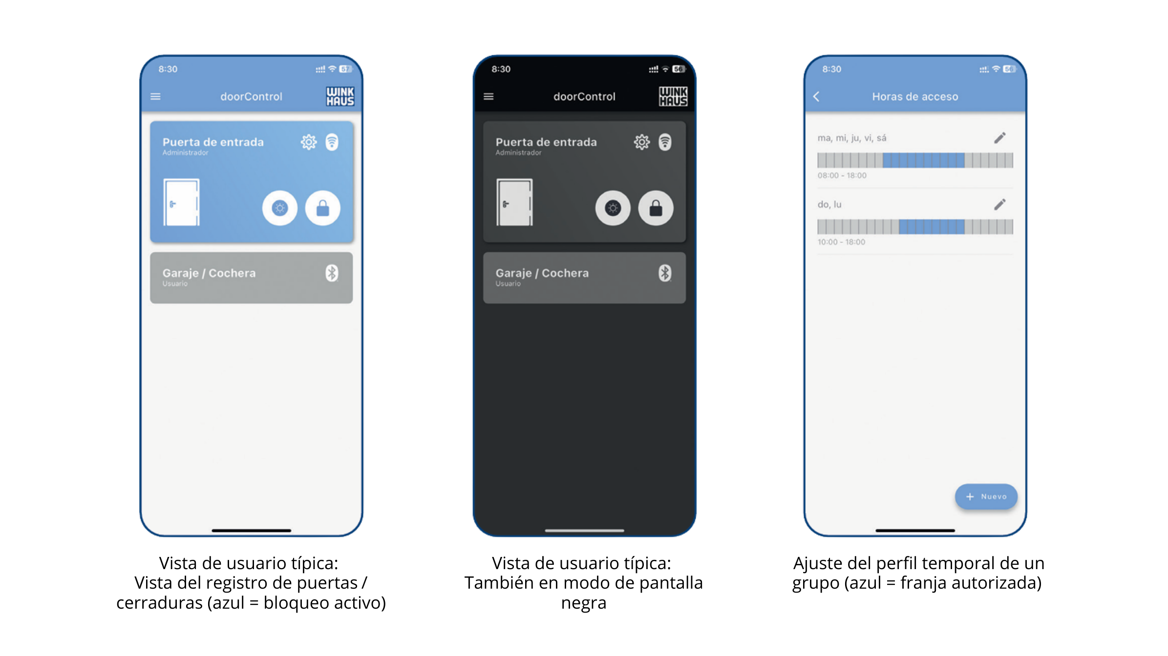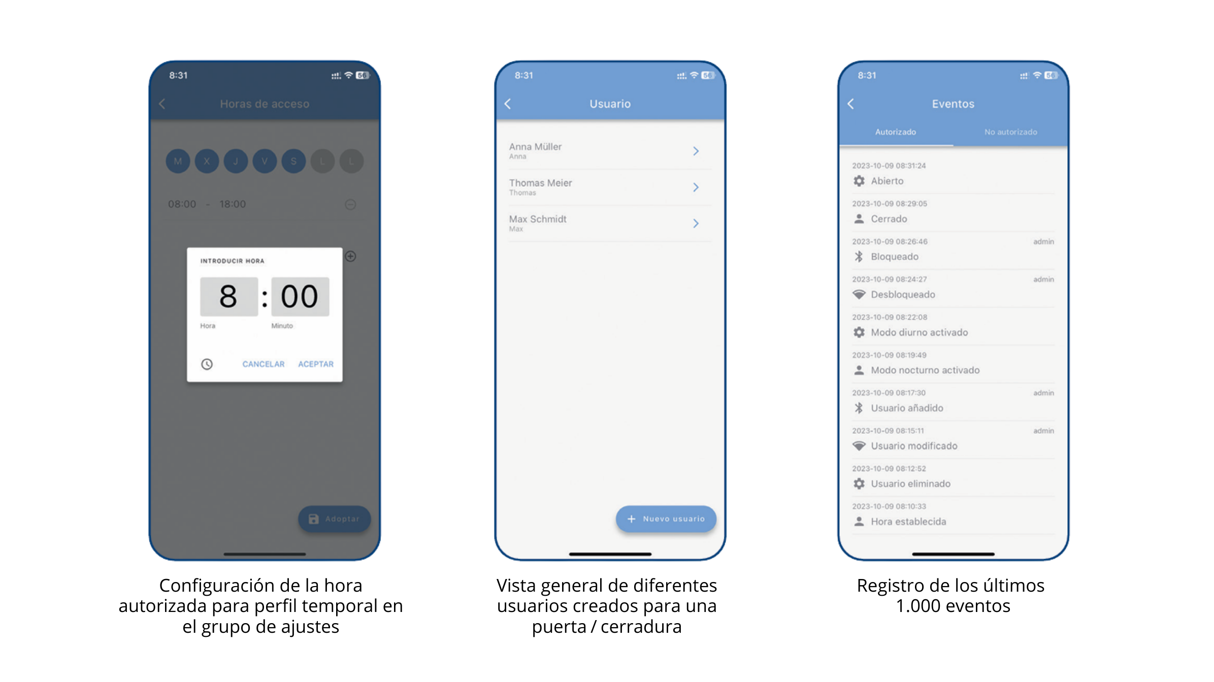 3. Creación de perfiles temporales: Se pueden adjudicar perfiles temporales, además de grupos con accesos limitados por franjas de horas/días. Hasta 25 puertas y 100 usuarios 4.