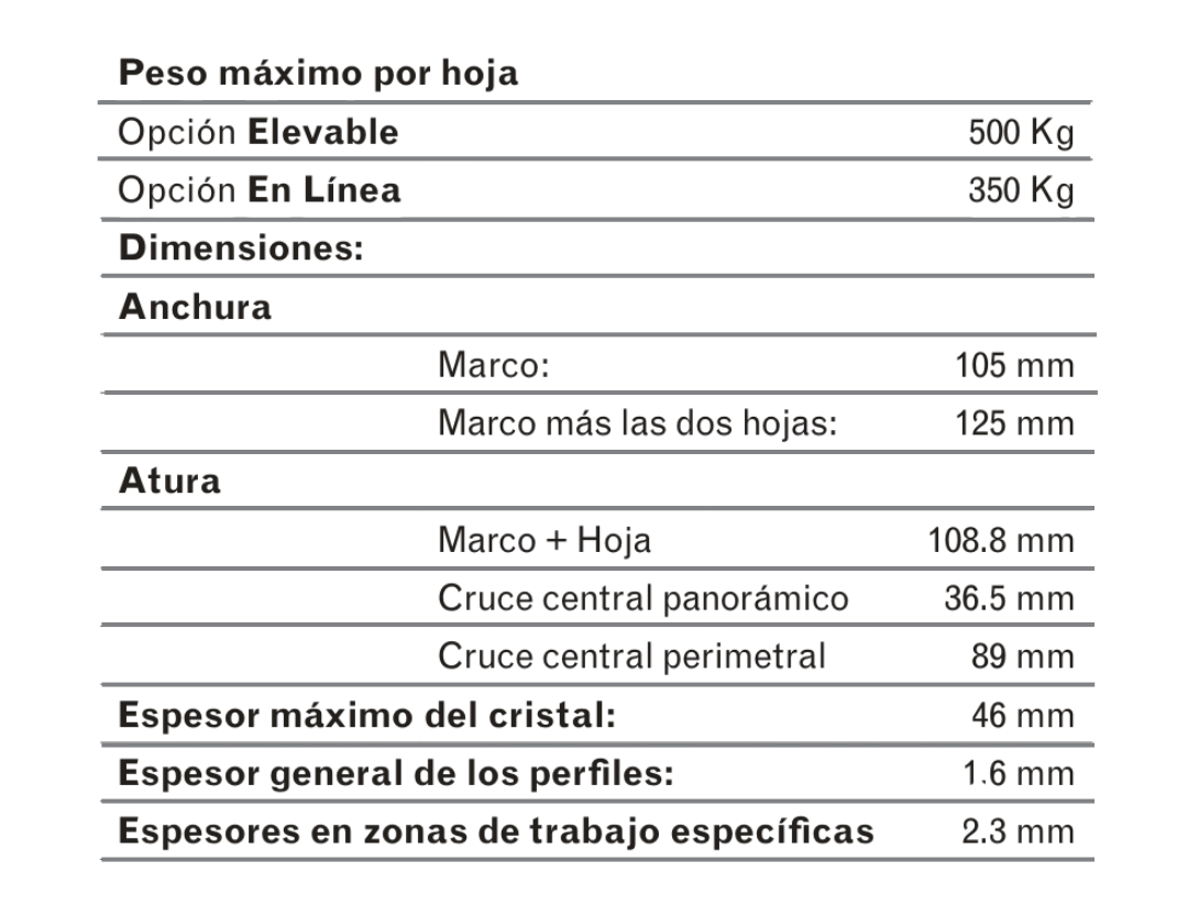 Admite acristalamientos de hasta 46 mm, incluyendo vidrios de doble cámara de aislamiento tipo “TRIPLEX”. Sus hojas ajunquilladas facilitan notablemente la instalación del vidrio, optimizando los tiempos de montaje y asegurando un acabado preciso y de alta calidad.