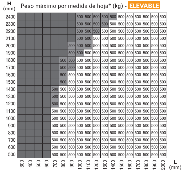 La versión Elevable permite soportar hojas de hasta 500 kg, gracias al uso de un conjunto de ruedas suplementarias y al kit de elevación LIFT UNIT, garantizando un desplazamiento suave incluso en grandes dimensiones.