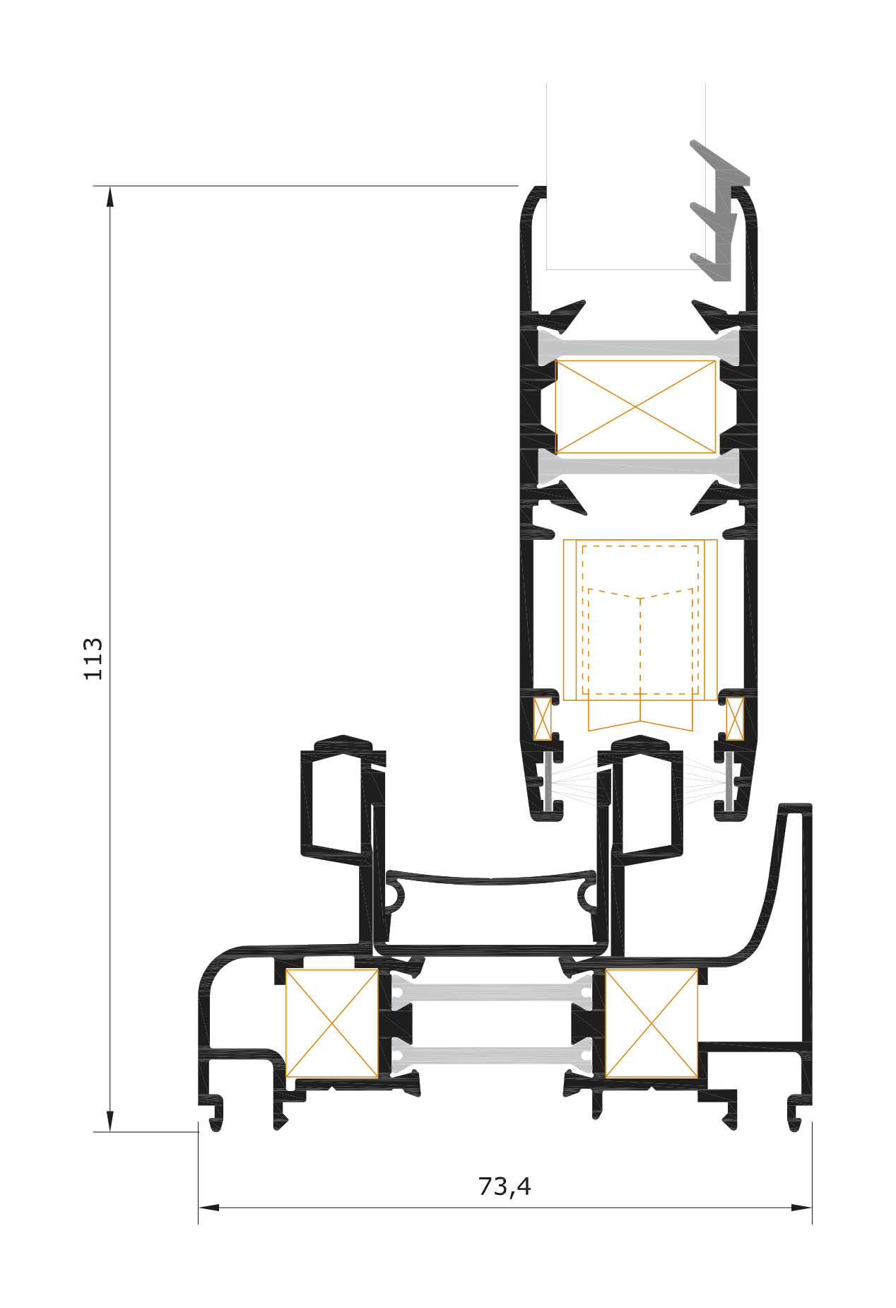 Para aumentar la estanqueidad y el aislamiento térmico y acústico dispone de un perfil de poliamida en forma de U invertida que permite desaguar en toda la longitud del marco inferior, y no sólo en la parte que da al exterior. Esta novedad está patentada y es presente en toda la gama de correderas.