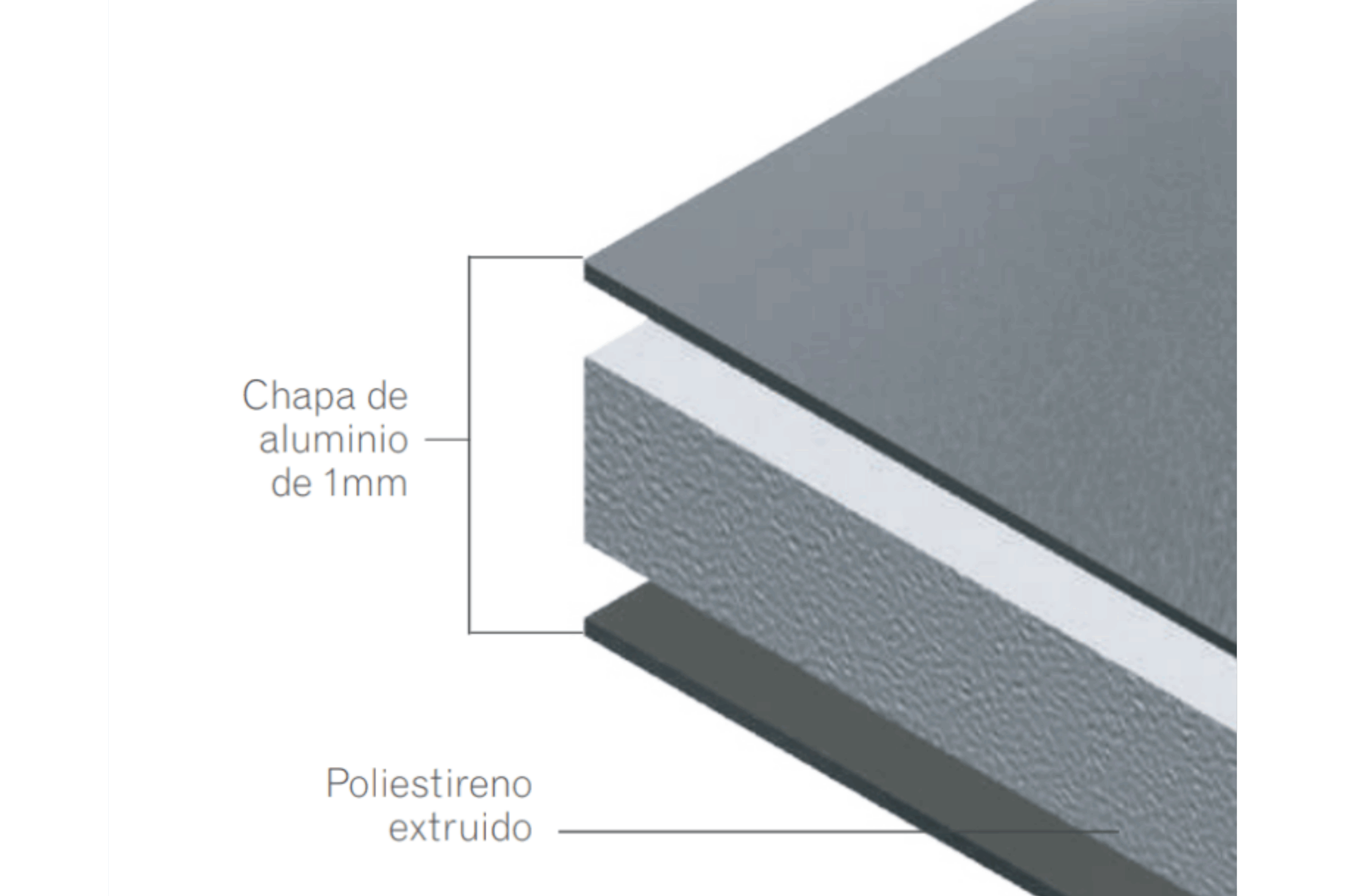 Innaltech fabrica los paneles Optima Face, formados por dos chapas de aluminio lacado de 2mm unidas a un núcleo de tablero hidrofugo marino de 18mm. También existe la posibilidad de paneles de 40mm, con doble núcleo de 18mm.