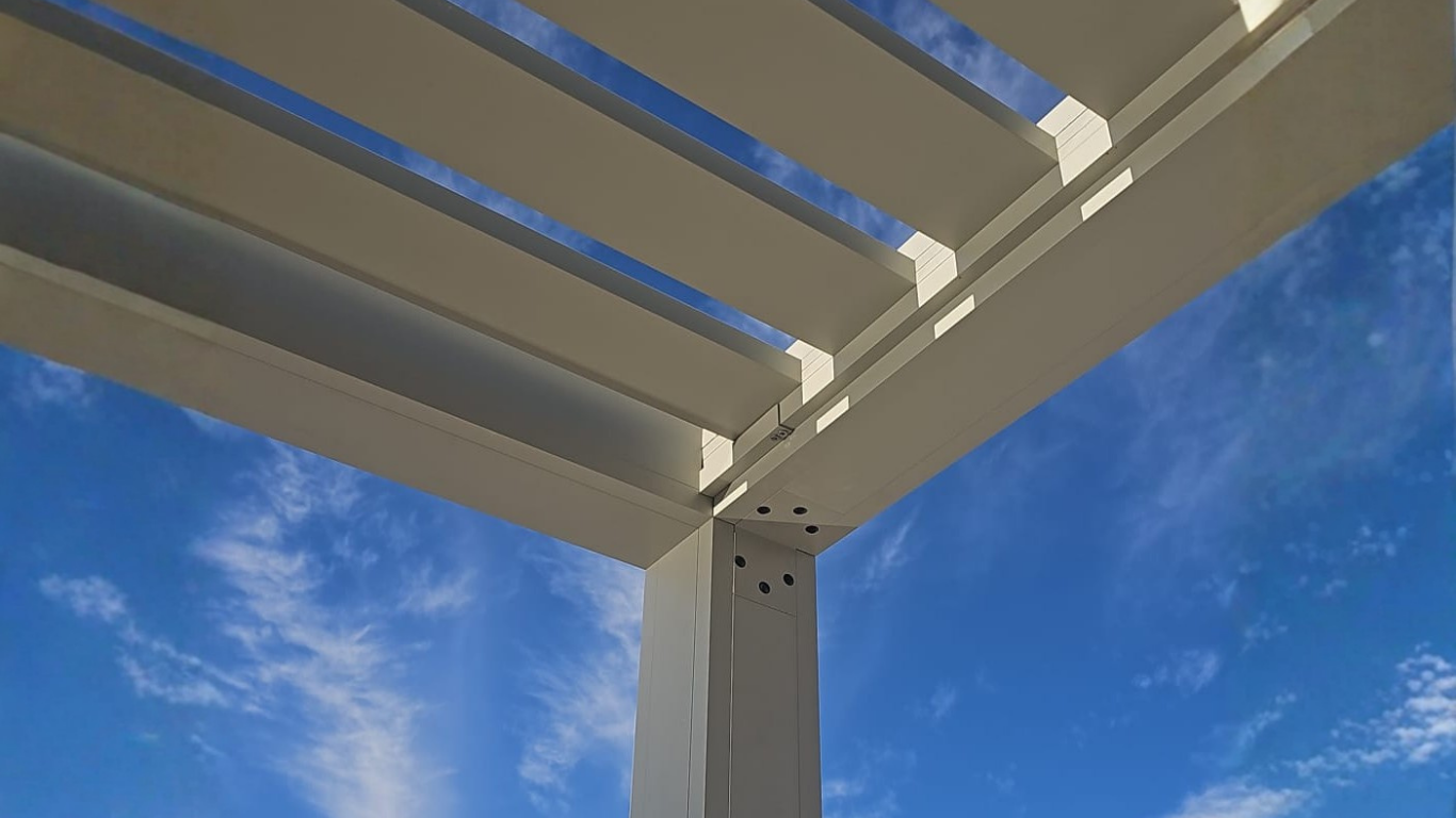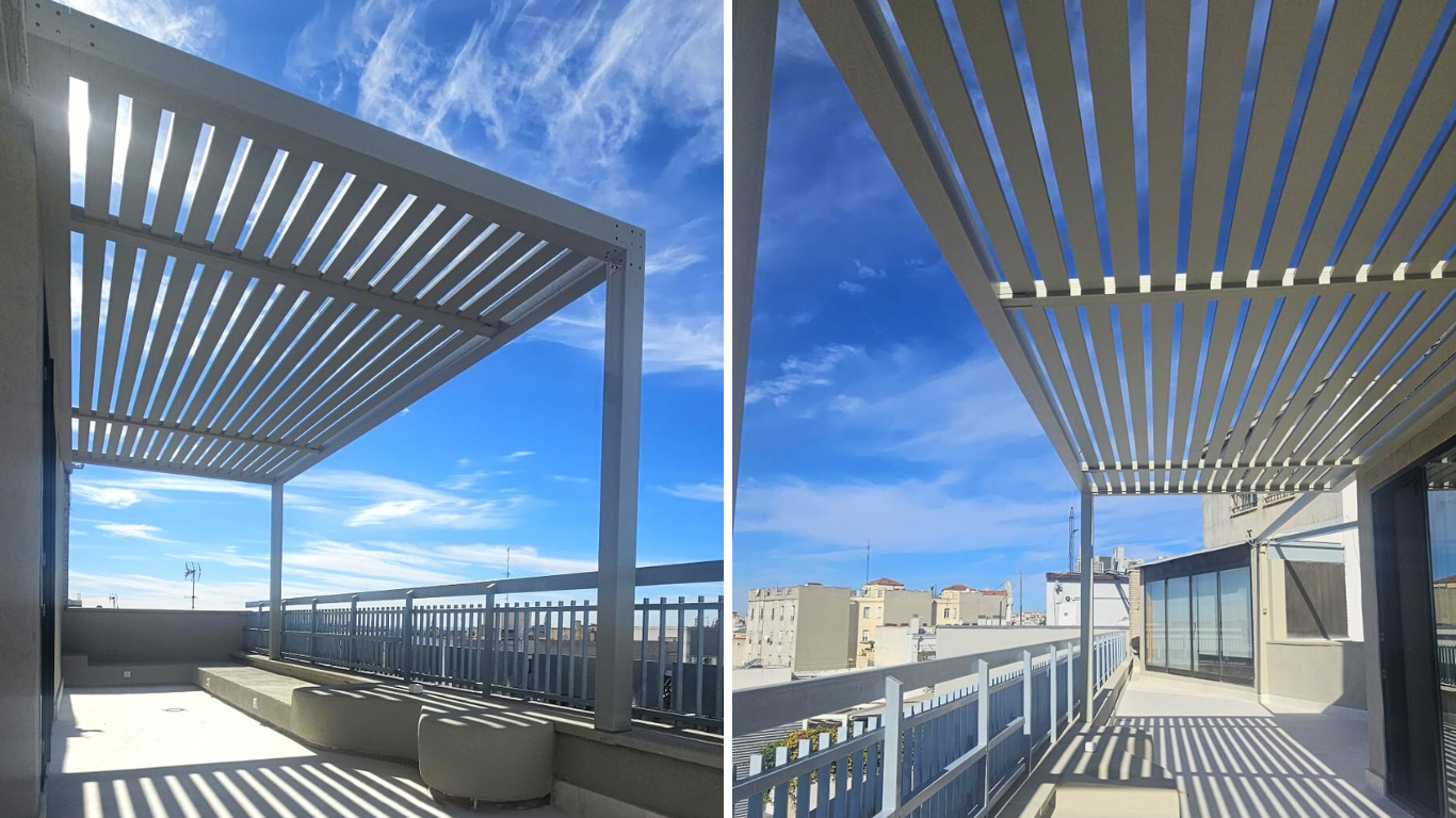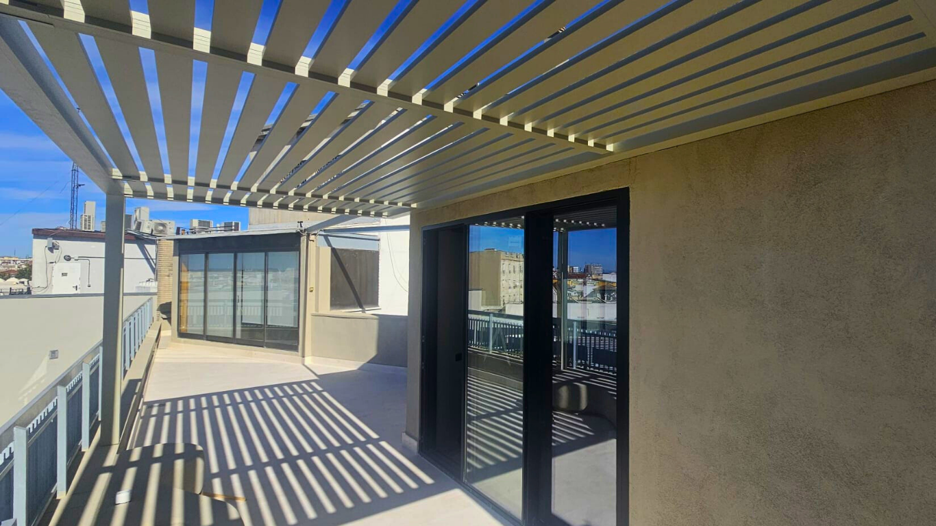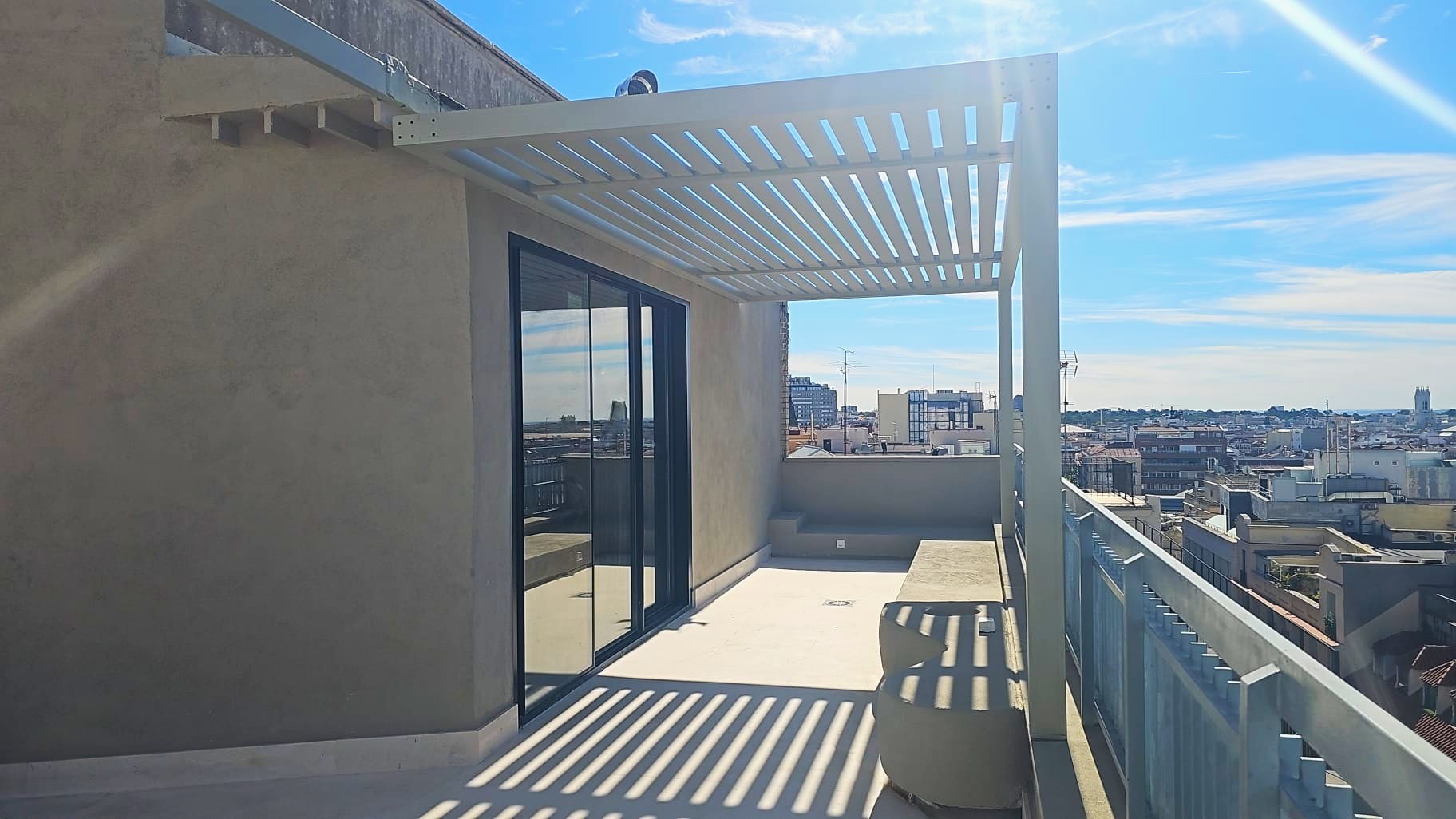 En esta terraza con inmejorables vistas a Madrid, instalamos nuestra pérgola CLOSED, elegante y resistente con listones de 50x25mm, totalmente integrada en el espacio.