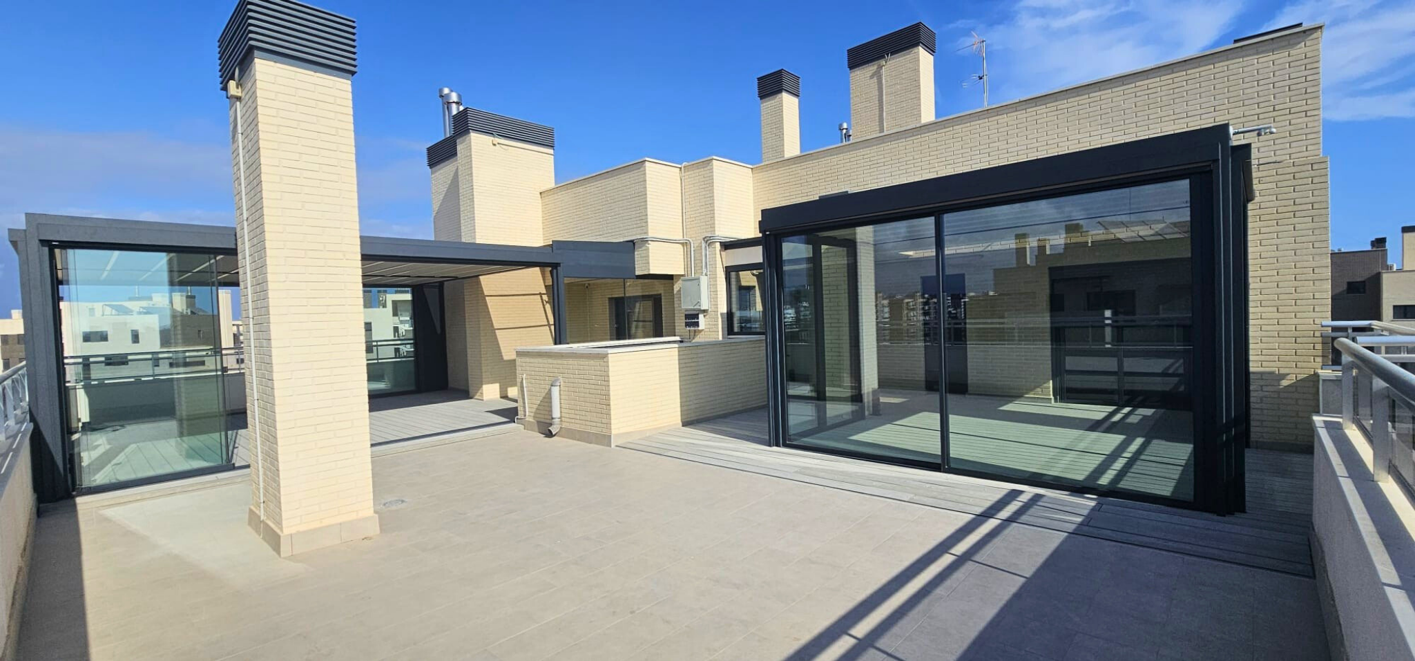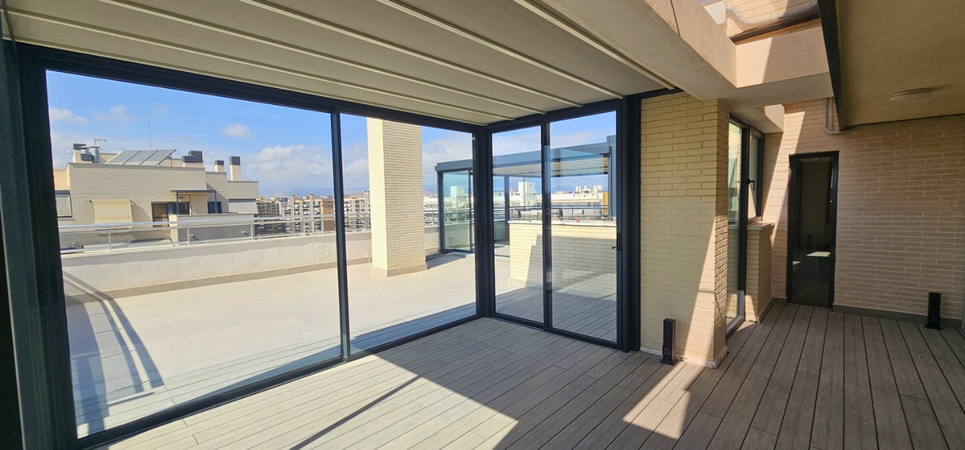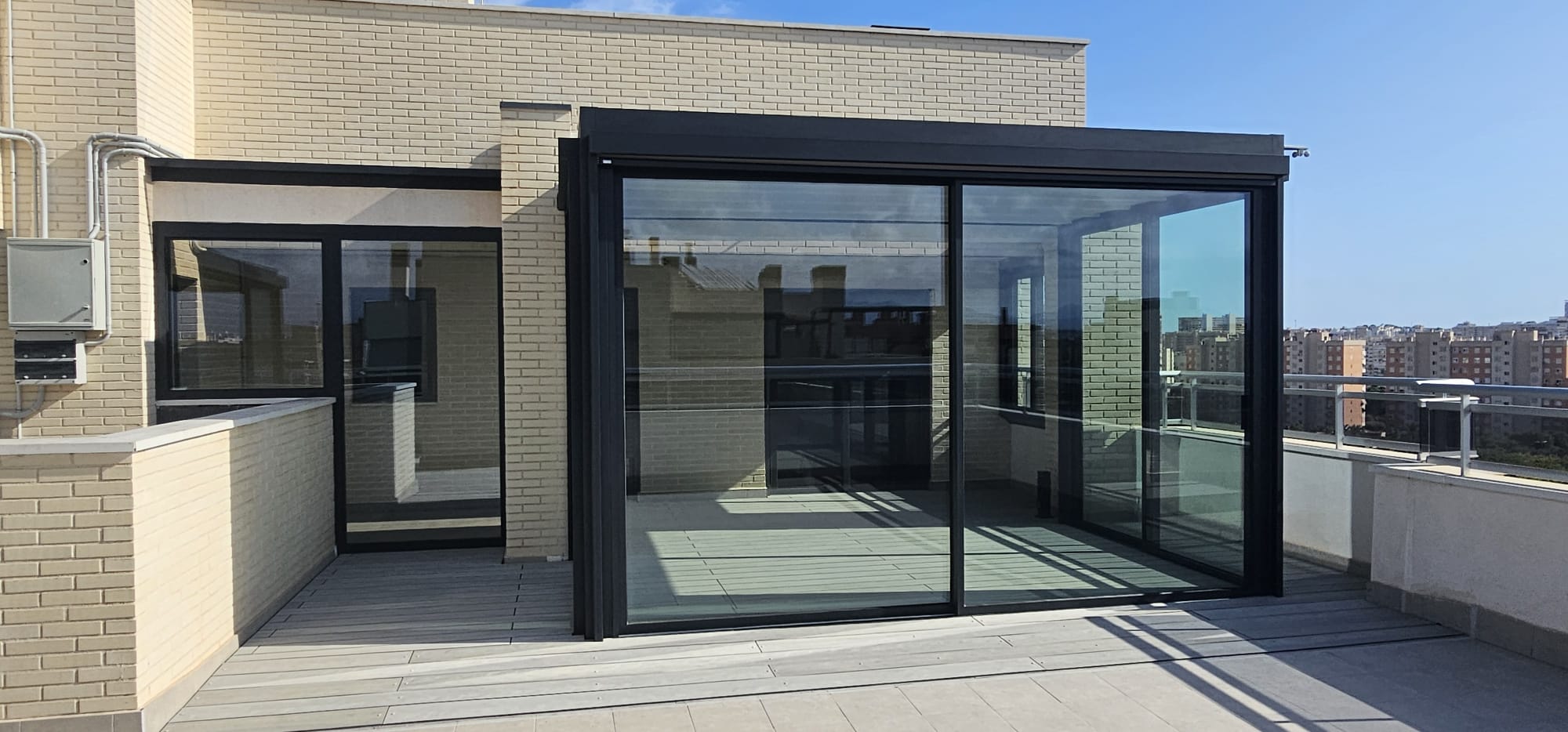 Un diseño y fabricación con perfiles propios de Innaltech que consiguen la total uniformidad estética en el interior, y el exterior, en este caso, los cerramientos y pérgolas fueron lacados con el mismo RAL que los respiradores de las chimeneas.
