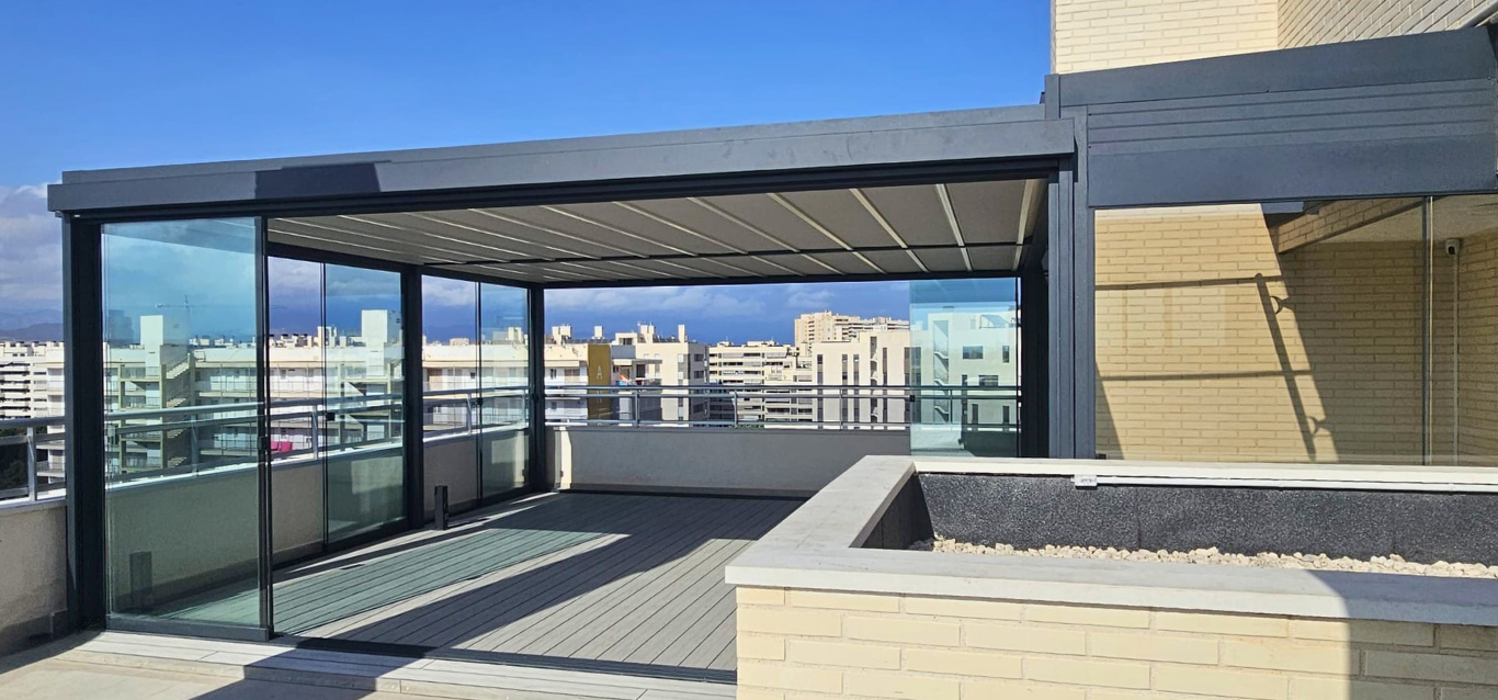 Nuestra pérgola CLOSED con panel cubierta es el sistema ideal para aquellos espacios que requieren un zona totalmente cubierta y protegida todo el año.