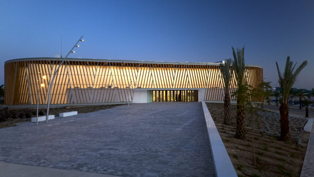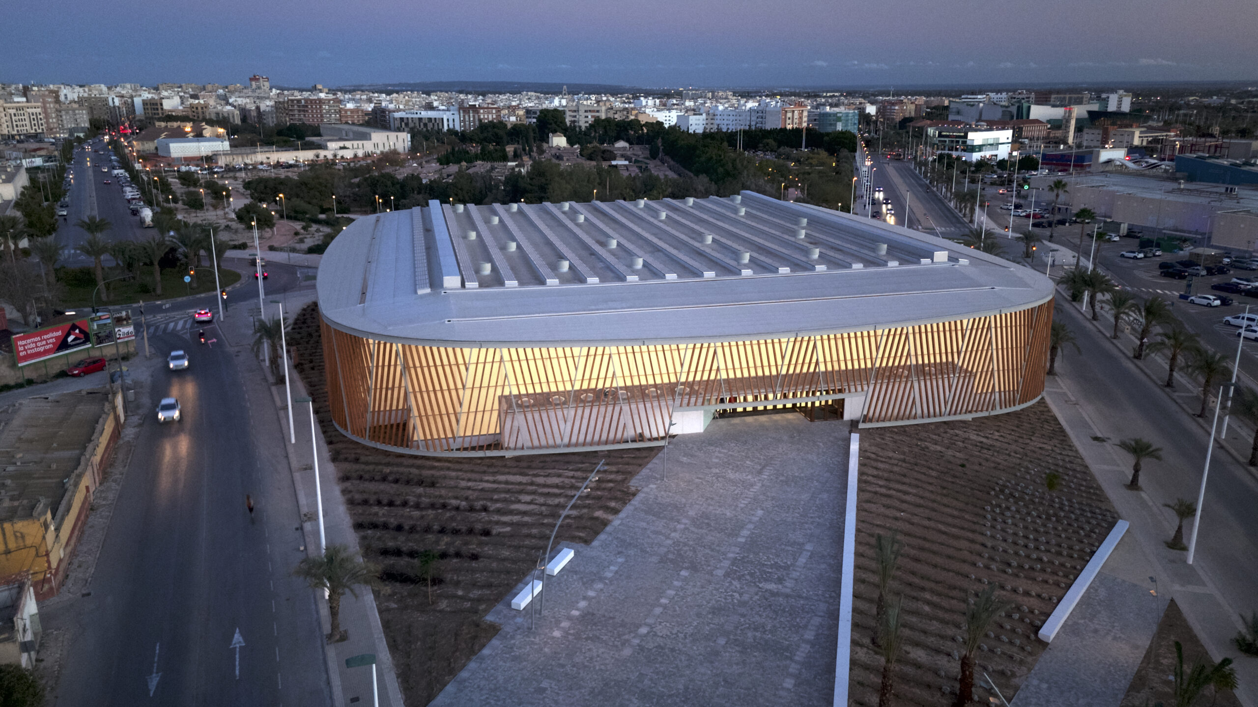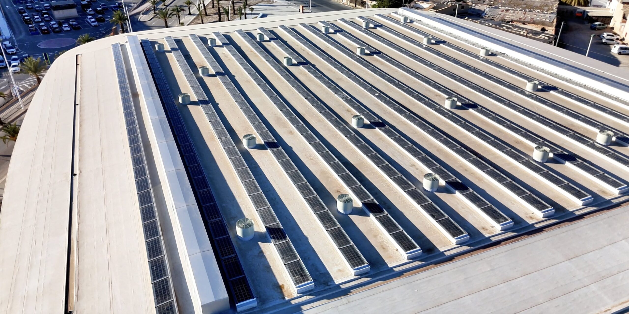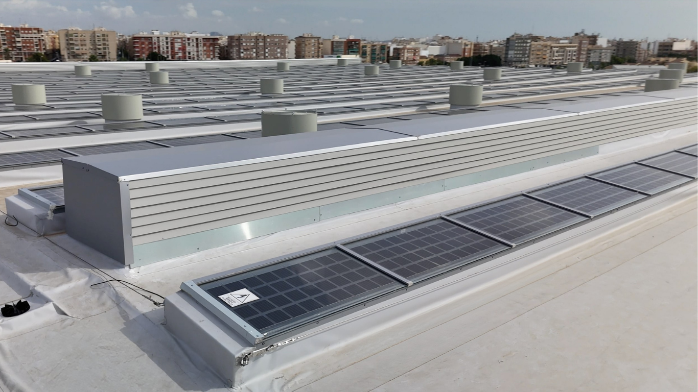 Detalle de los perfiles MC60 de Innaltech, nuestro muro cortina, adaptado al diseño de los lucernarios con paneles solares. Un desarrollo industrial propio muy habitual que realizamos en otros proyectos, tanto en equipamientos como en vivienda residencial.