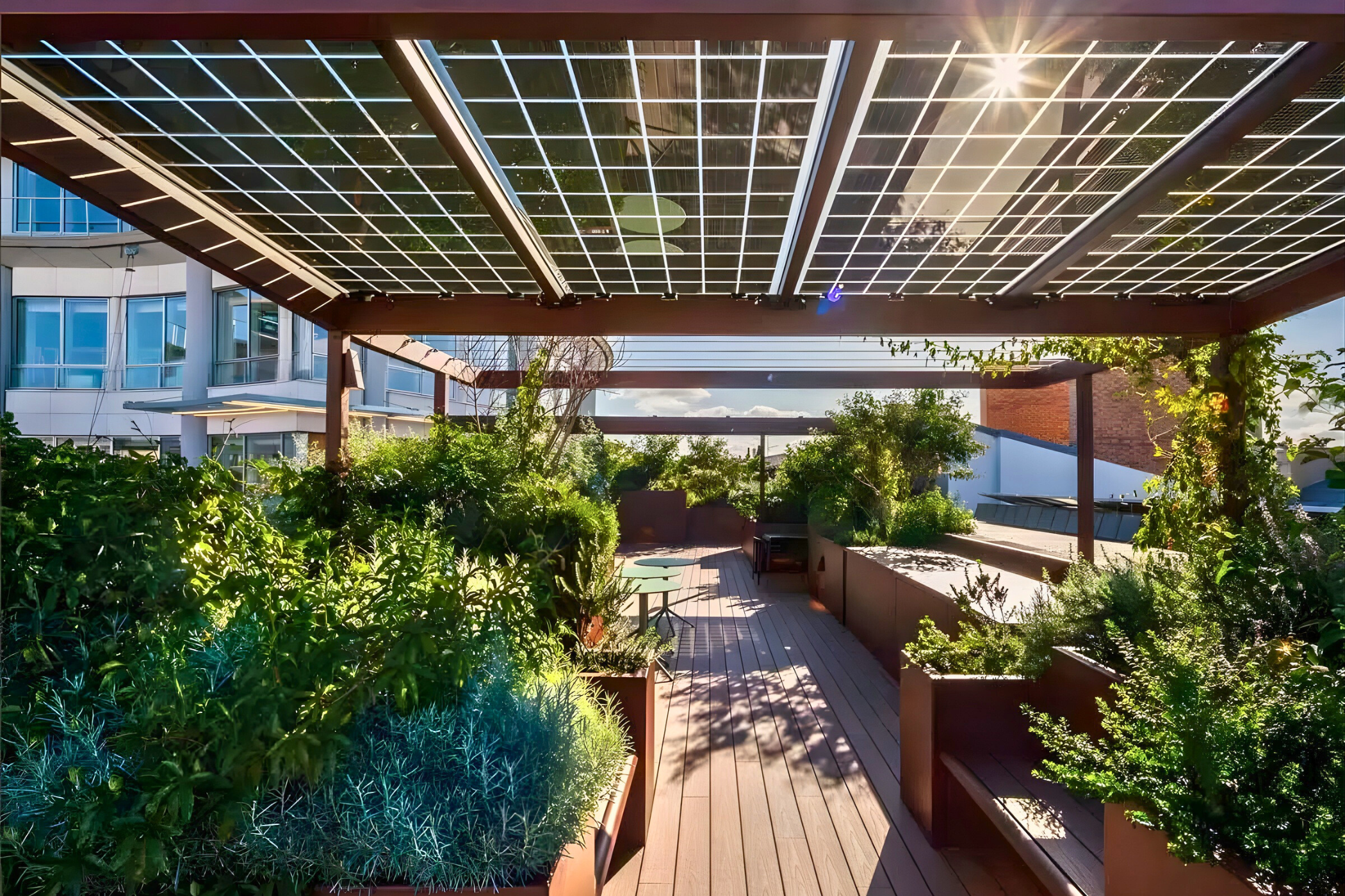 Closed permite conjugar diferentes modalidades de pérgola al mismo tiempo. Se pueden realizar laterales con tubos y lamas y, es posible hacer el techo con cristal o placas solares.